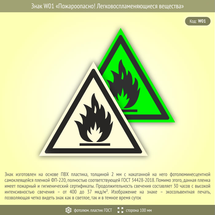 Знак W01 «Пожароопасно! Легковоспламеняющиеся вещества» (фотолюминесцентный пластик ГОСТ 34428-2018, сторона 100 мм) в Хотьково купить