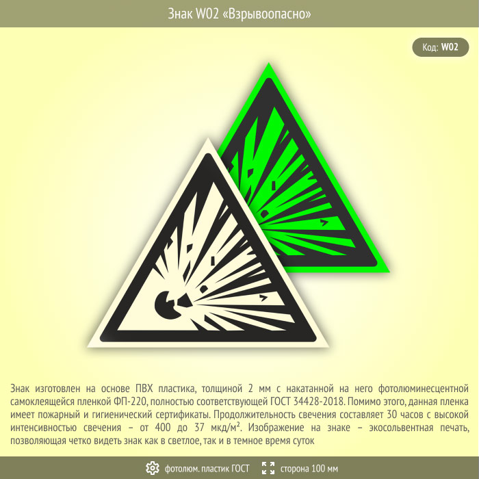 Знак W02 «Взрывоопасно» (фотолюминесцентный пластик ГОСТ 34428-2018, сторона 100 мм) в Хотьково купить
