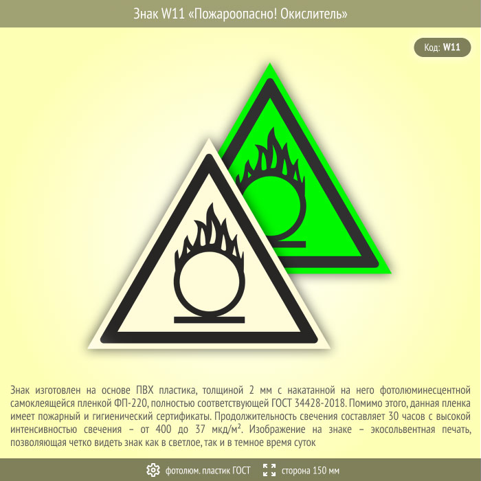 Знак W11 «Пожароопасно! Окислитель» (фотолюминесцентный пластик ГОСТ 34428-2018, сторона 150 мм) в Хотьково купить
