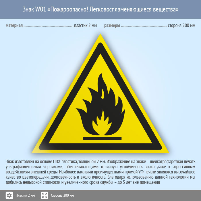 Знак W01 «Пожароопасно! легковоспламеняющиеся вещества» (пластик, сторона 200 мм) в Хотьково купить