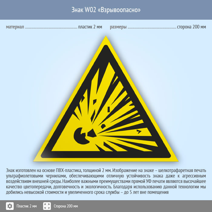 Знак W02 «Взрывоопасно» (пластик, сторона 200 мм) в Хотьково купить