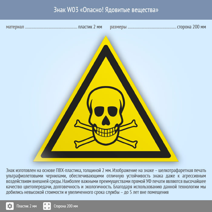Знак W03 «Опасно! ядовитые вещества» (пластик, сторона 200 мм) в Хотьково купить