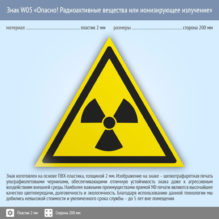 Знак W05 «Опасно! радиоактивные вещества или ионизирующее излучение» (пластик, сторона 200 мм) в Хотьково купить