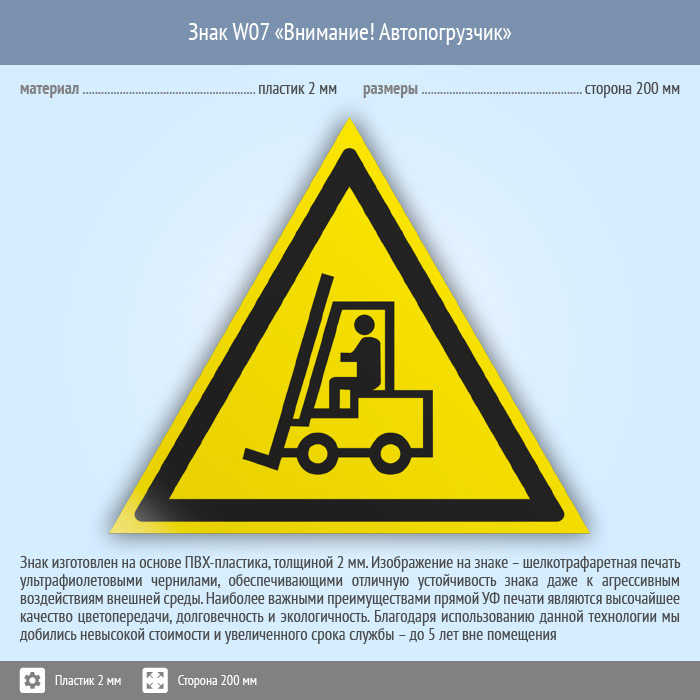 Знак W07 «Внимание! автопогрузчик» (пластик, сторона 200 мм) в Хотьково купить