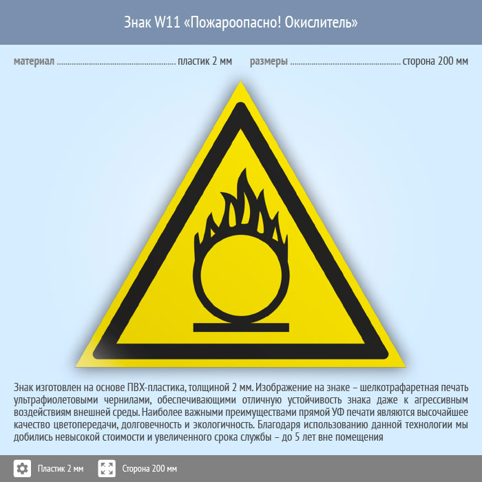 Знак W11 «Пожароопасно! окислитель» (пластик, сторона 200 мм) в Хотьково купить