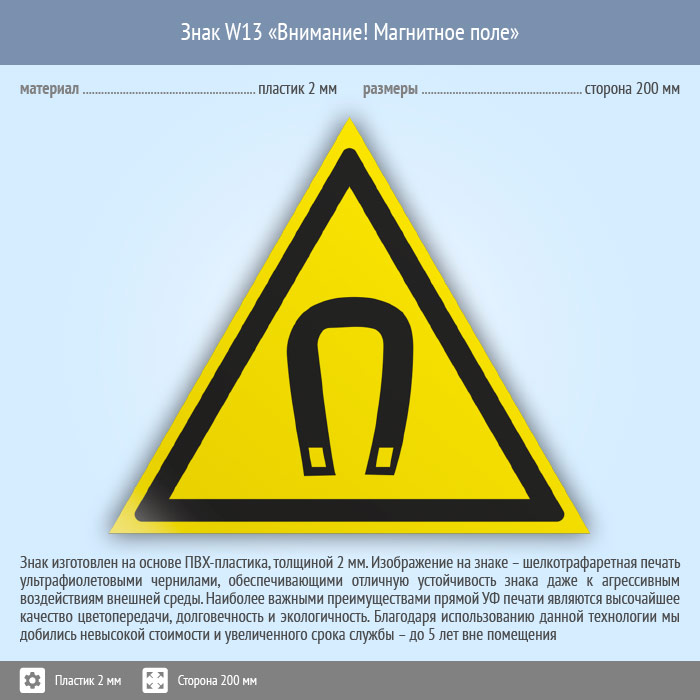 Знак W13 «Внимание! магнитное поле» (пластик, сторона 200 мм) в Хотьково купить