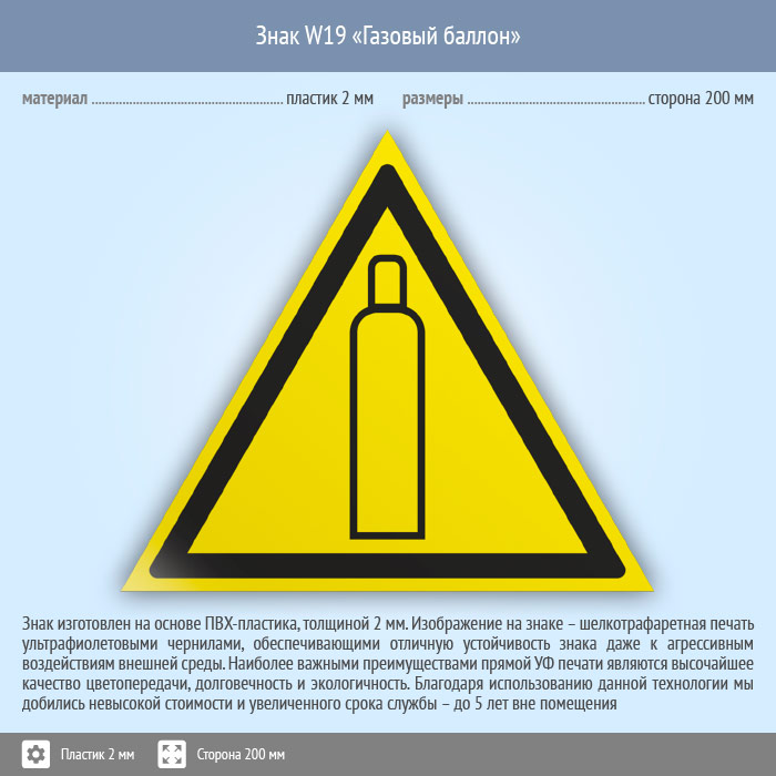 Знак W19 «Газовый баллон» (пластик, сторона 200 мм) в Хотьково купить