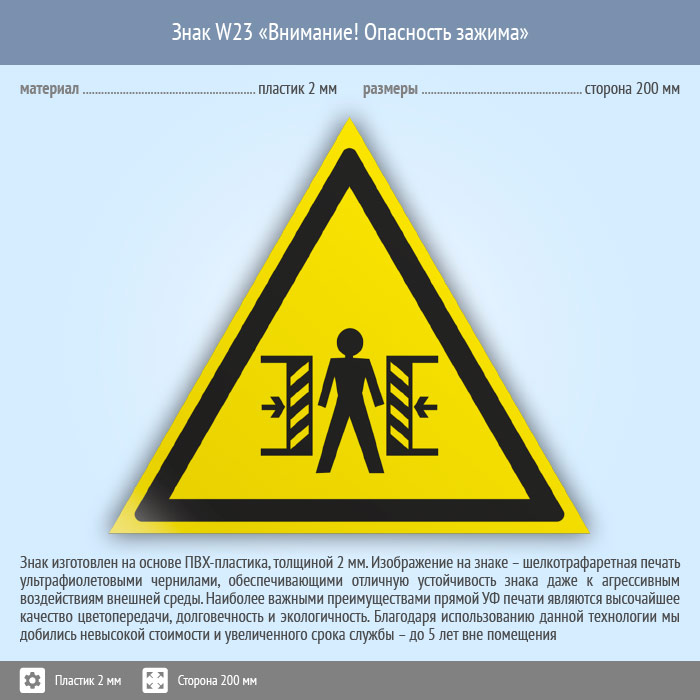Знак W23 «Внимание! опасность зажима» (пластик, сторона 200 мм) в Хотьково купить