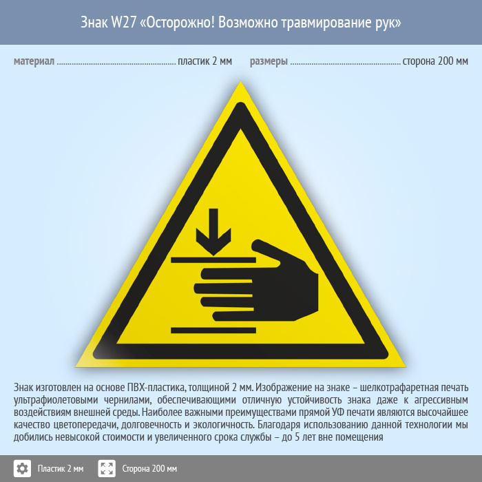 Знак W27 «Осторожно! возможно травмирование рук» (пластик, сторона 200 мм) в Хотьково купить