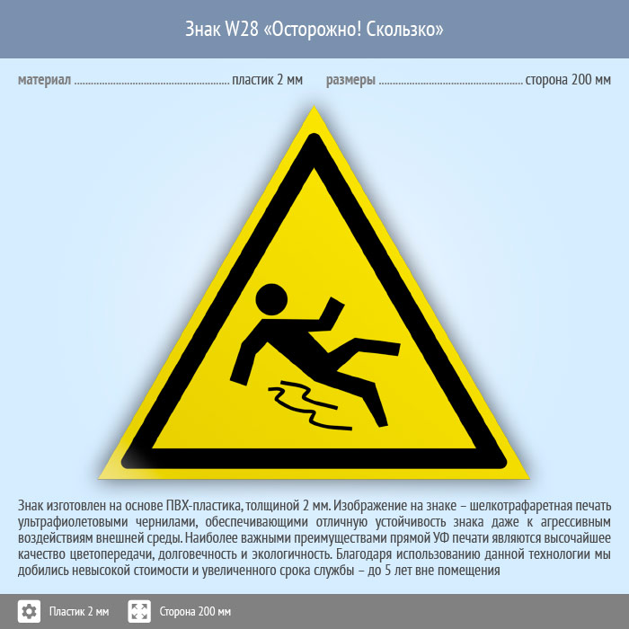 Знак W28 «Осторожно! скользко» (пластик, сторона 200 мм) в Хотьково купить