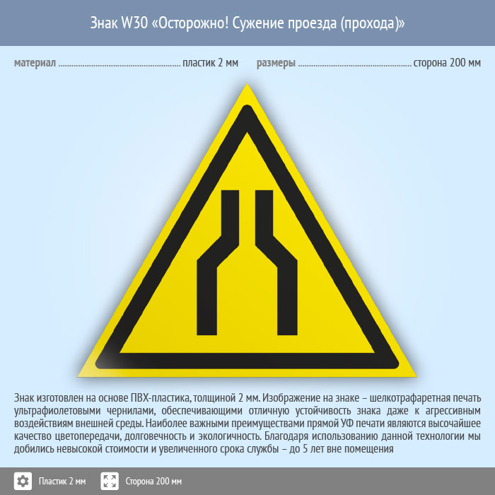 Знак W30 «Осторожно! сужение проезда (прохода)» (пластик, сторона 200 мм) в Хотьково купить