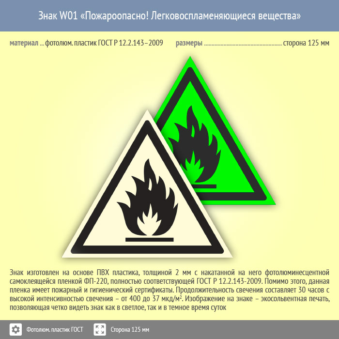 Знак W01 «Пожароопасно! Легковоспламеняющиеся вещества» (фотолюминесцентный пластик ГОСТ 34428-2018, сторона 125 мм) в Хотьково купить