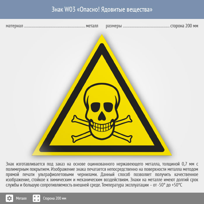 Знак W03 «Опасно! ядовитые вещества» (металл, сторона 200 мм) в Хотьково купить