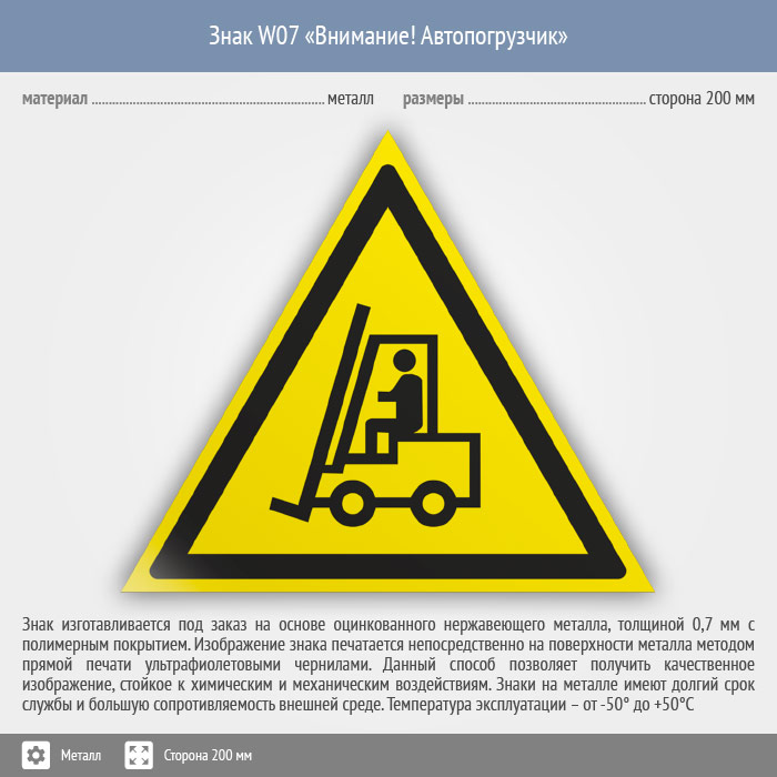 Знак W07 «Внимание! автопогрузчик» (металл, сторона 200 мм) в Хотьково купить