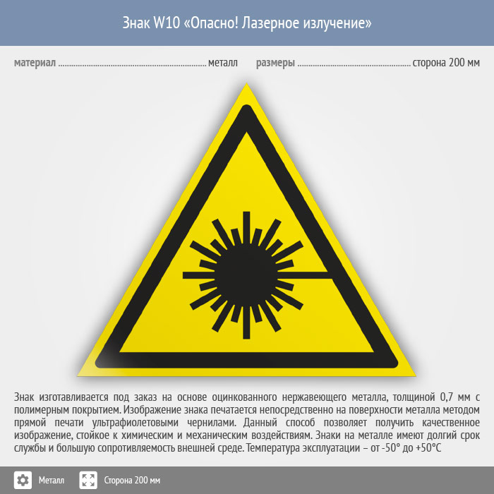Знак W10 «Опасно! лазерное излучение» (металл, сторона 200 мм) в Хотьково купить