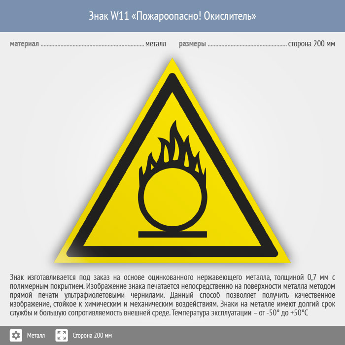 Знак W11 «Пожароопасно! окислитель» (металл, сторона 200 мм) в Хотьково купить