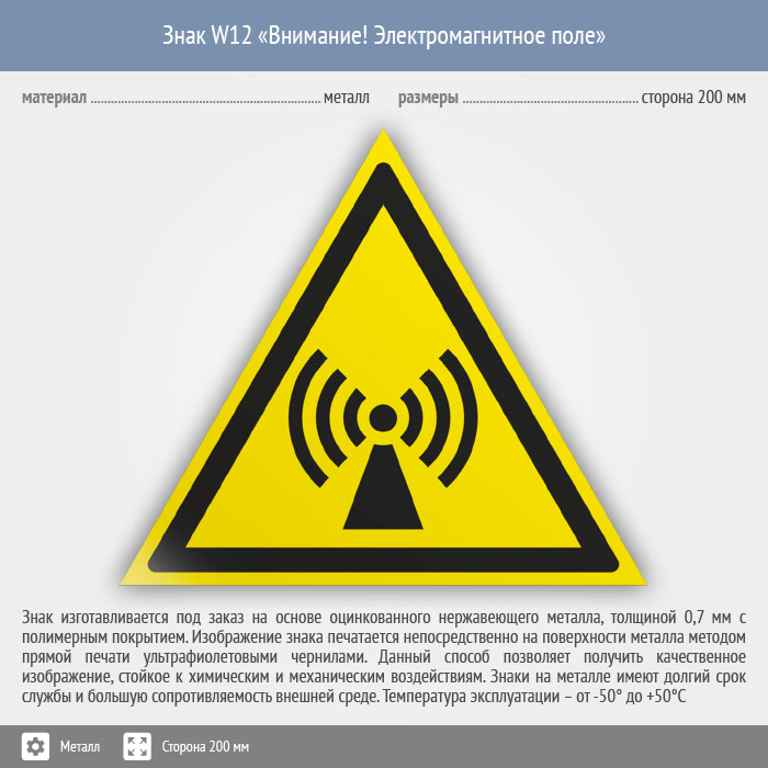 Знак W12 «Внимание! электромагнитное поле» (металл, сторона 200 мм) в Хотьково купить