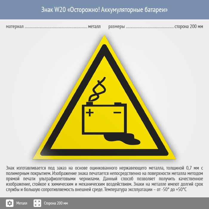 Знак W20 «Осторожно! аккумуляторные батареи» (металл, сторона 200 мм) в Хотьково купить