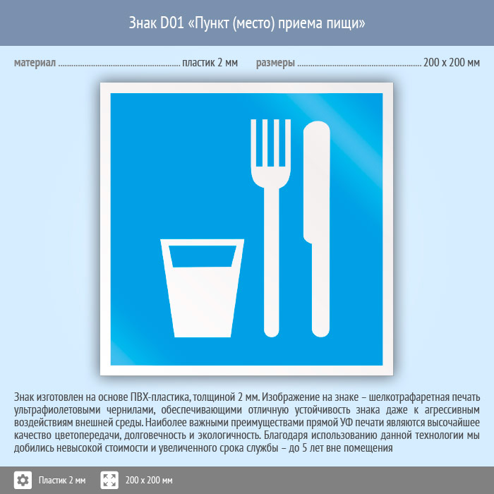 Знак D01 «Пункт (место) приема пищи» (пластик, 200х200 мм) в Хотьково купить