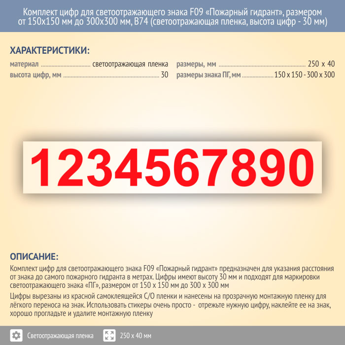 Комплект цифр для светоотражающего знака F09 «Пожарный гидрант», размером от 150х150 мм до 300х300 мм, В74 (светоотражающая пленка, 250х40 мм, высота цифр - 30 мм) в Хотьково купить