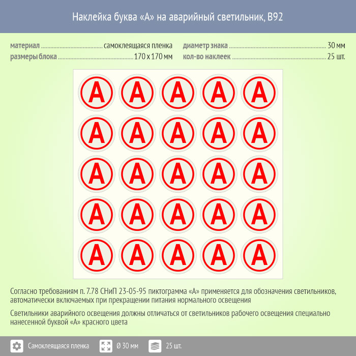 Наклейка буква «А» на аварийный светильник, B92 (пленка, диаметр 30 мм, блок 25 штук, 170х170 мм) в Хотьково купить
