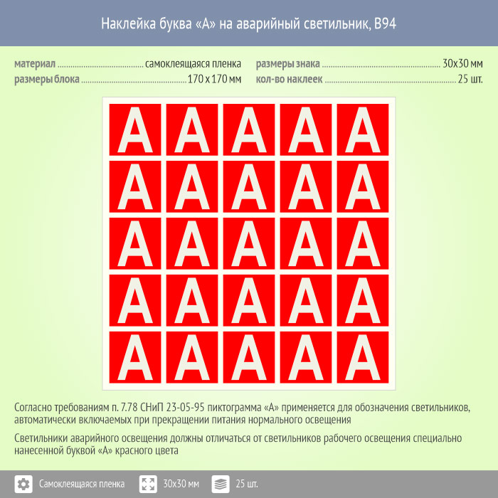 Наклейка буква «А» на аварийный светильник, B94 (пленка, 30х30 мм, блок 25 штук, 170х170 мм) в Хотьково купить