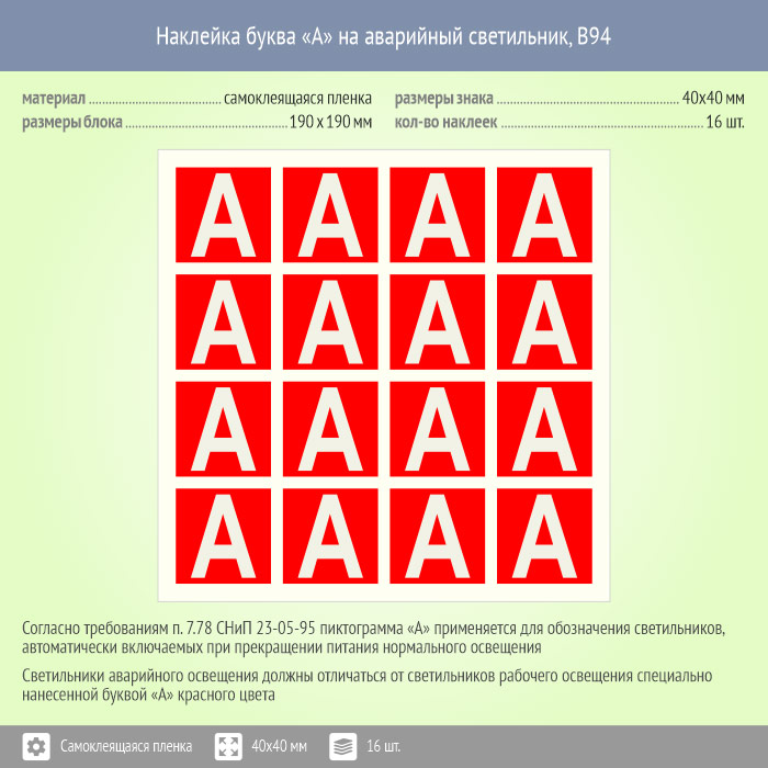 Наклейка буква «А» на аварийный светильник, B94 (пленка, 40х40 мм, блок 16 штук, 190х190 мм) в Хотьково купить