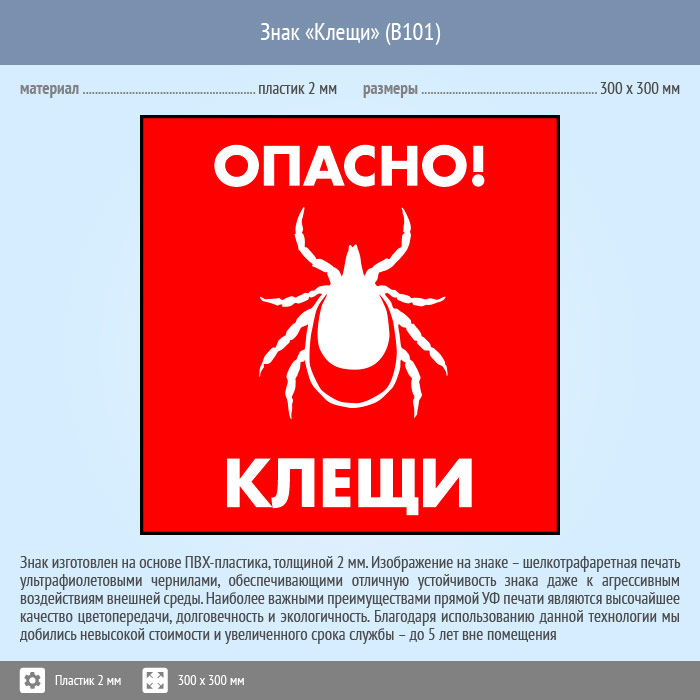 Знак «Опасно! Клещи», B101 (пластик, 300х300 мм) в Хотьково купить