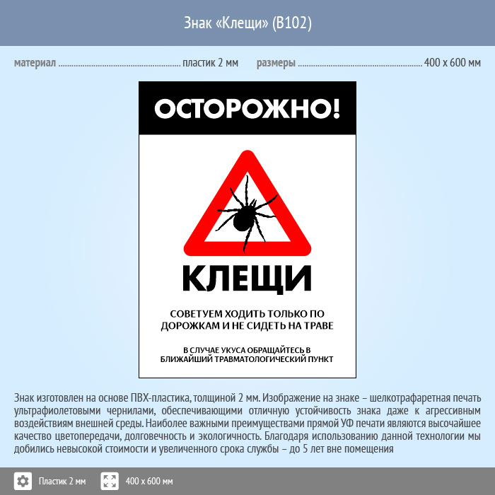 Знак «Осторожно! Клещи», B102 (пластик, 300х400 мм) в Хотьково купить