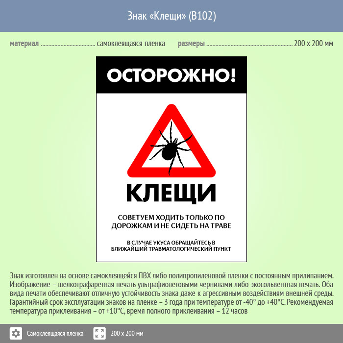Знак «Осторожно! Клещи», B102 (пленка, 400х600 мм) в Хотьково купить
