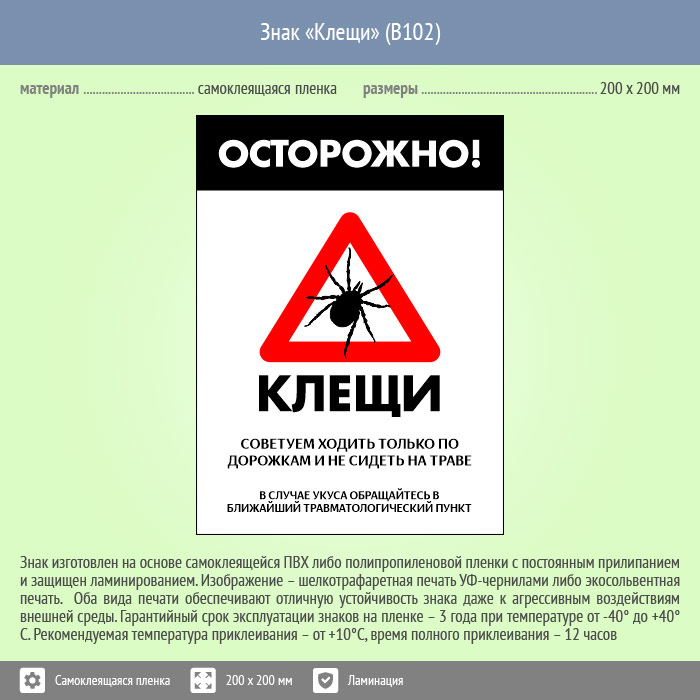 Знак «Осторожно! Клещи», B102 (пленка c ламинированием, 400х600 мм) в Хотьково купить