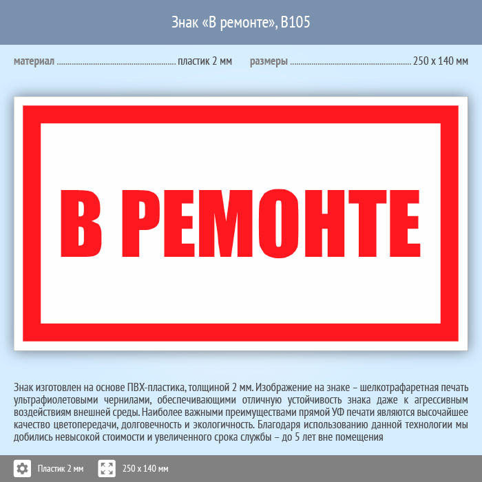 Знак «В ремонте», B105 (пластик, 250х140 мм) в Хотьково купить
