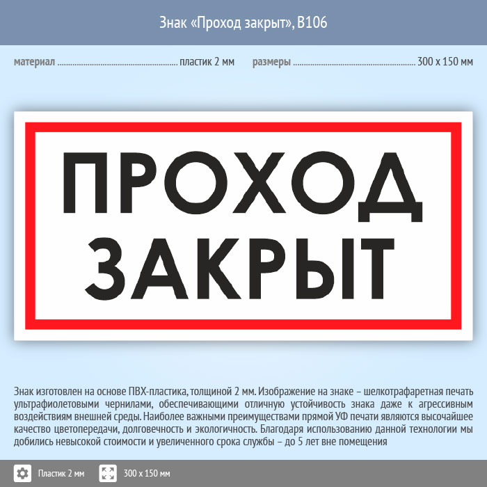 Знак «Проход закрыт», B106 (пластик, 300х150 мм) в Хотьково купить