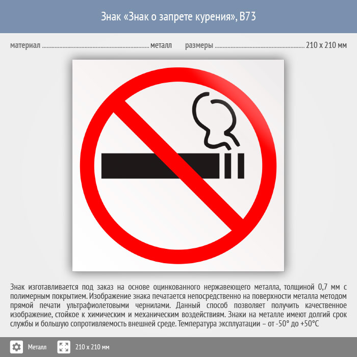 Знак «Знак о запрете курения», B73 (металл, 210х210 мм) в Хотьково купить