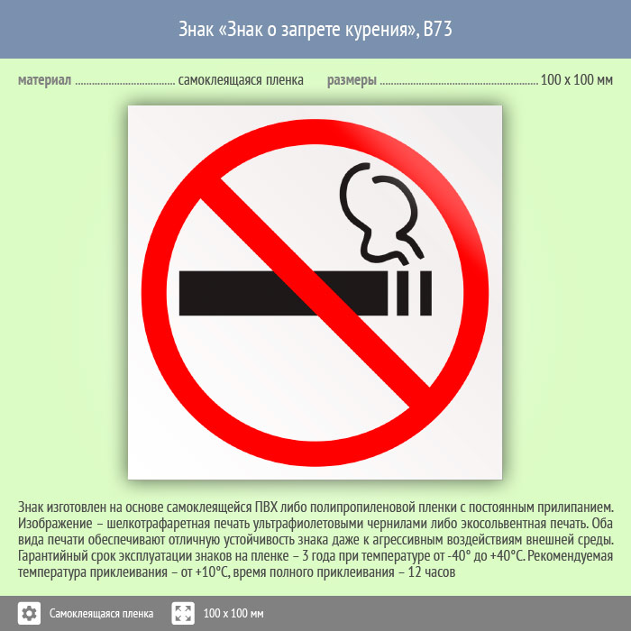 Знак «Знак о запрете курения», B73 (пленка, 100х100 мм) в Хотьково купить