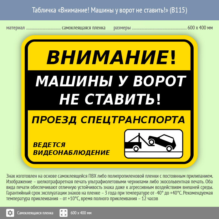 Табличка «Внимание! Машины у ворот не ставить!», B115 (пленка, 600х400 мм) в Хотьково купить