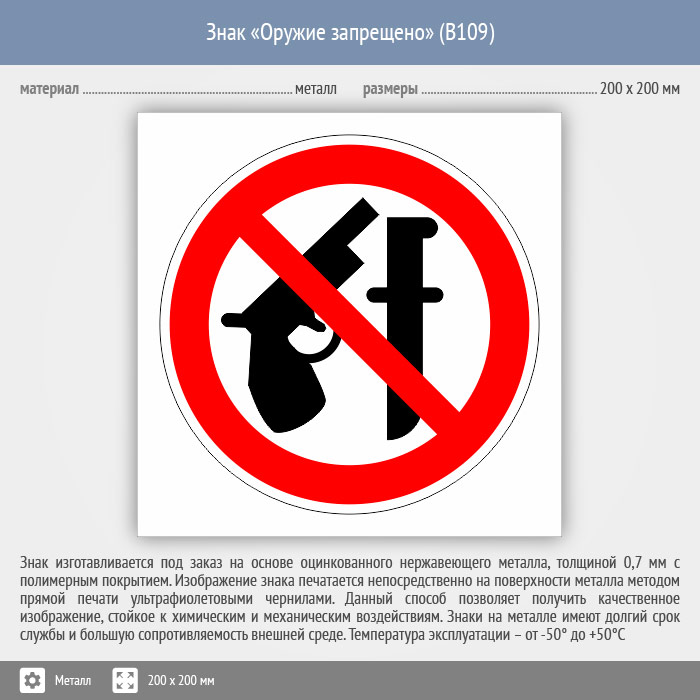 Знак «Оружие запрещено», B109 (металл, 200х200 мм) в Хотьково купить