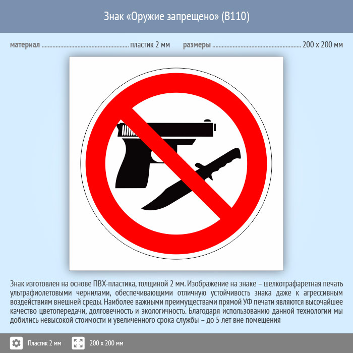 Знак «Оружие запрещено», B110 (пластик, 200х200 мм) в Хотьково купить