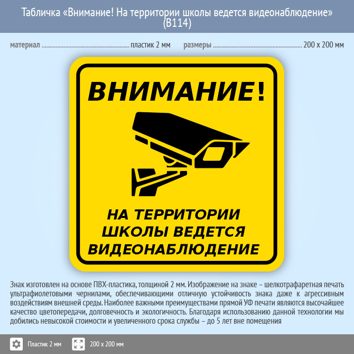 Табличка «Внимание! На территории школы ведется видеонаблюдение», B114 (пластик, 200х200 мм) в Хотьково купить