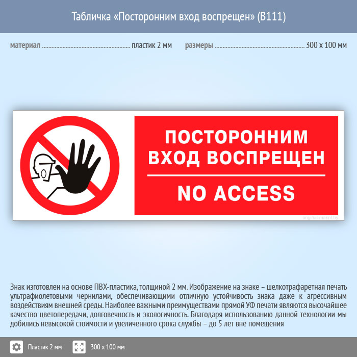 Табличка «Посторонним вход воспрещен», B111 (пластик, 300х100 мм) в Хотьково купить
