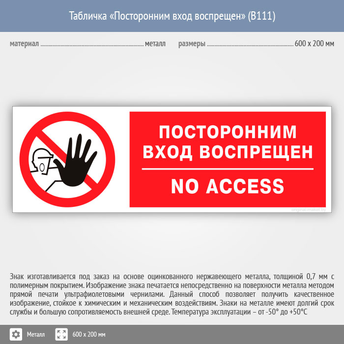 Табличка «Посторонним вход воспрещен», B111 (металл, 600х200 мм) в Хотьково купить