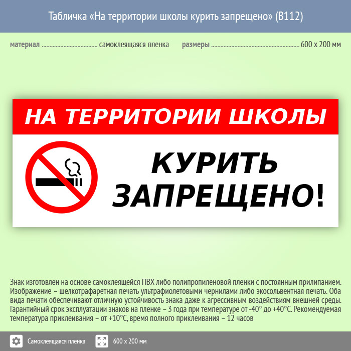 Табличка «На территории школы курить запрещено», B112 (пленка, 600х200 мм) в Хотьково купить