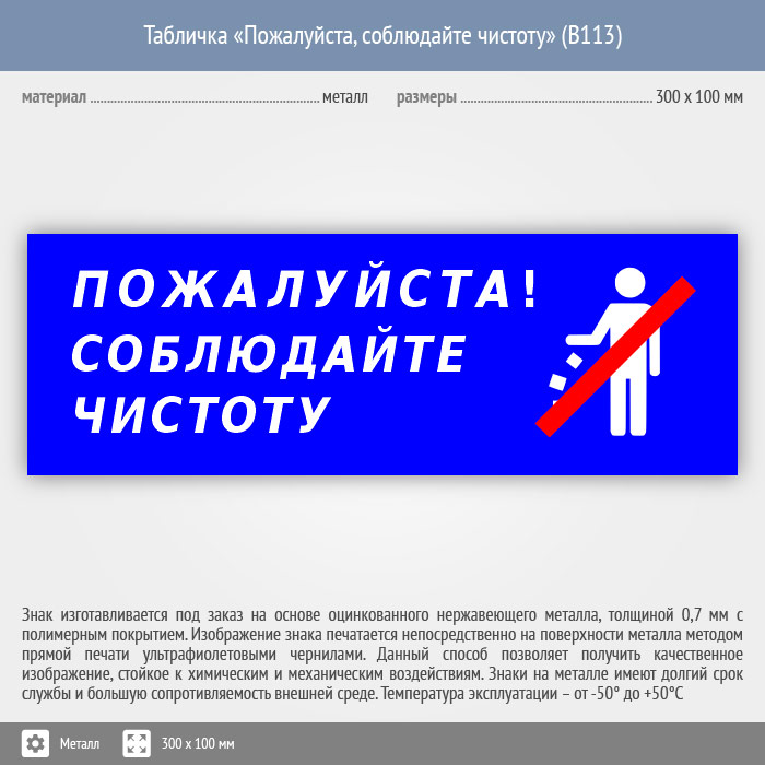 Табличка «Пожалуйста, соблюдайте чистоту», B113 (металл, 300х100 мм) в Хотьково купить
