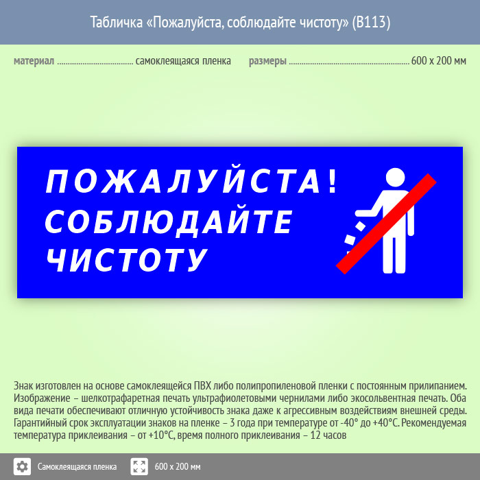 Табличка «Пожалуйста, соблюдайте чистоту», B113 (пленка, 600х200 мм) в Хотьково купить