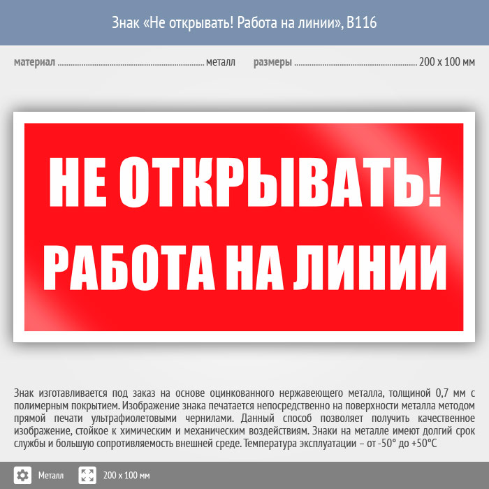 Знак «Не открывать! Работа на линии», B116 (металл, 200х100 мм) в Хотьково купить