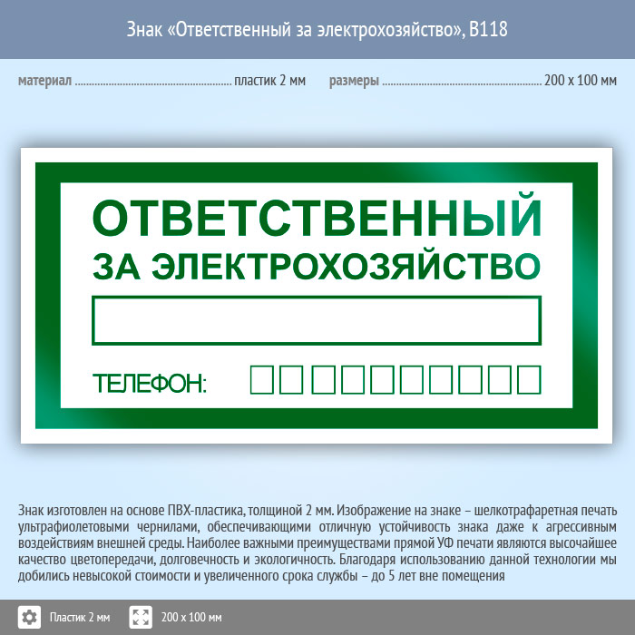 Знак «Ответственный за электрохозяйство», B118 (пластик, 200х100 мм) в Хотьково купить