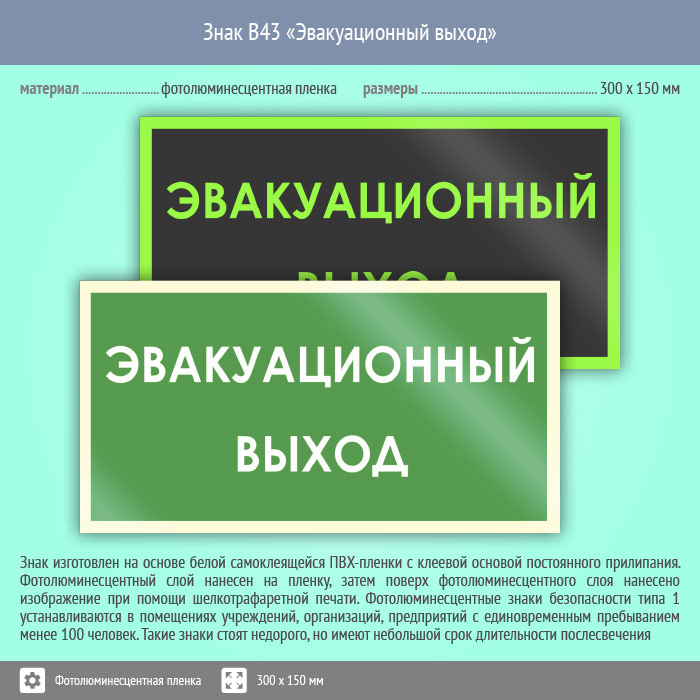 Знак B43 «Эвакуационный выход» (фотолюминесцентная пленка, 300х150 мм) в Хотьково купить