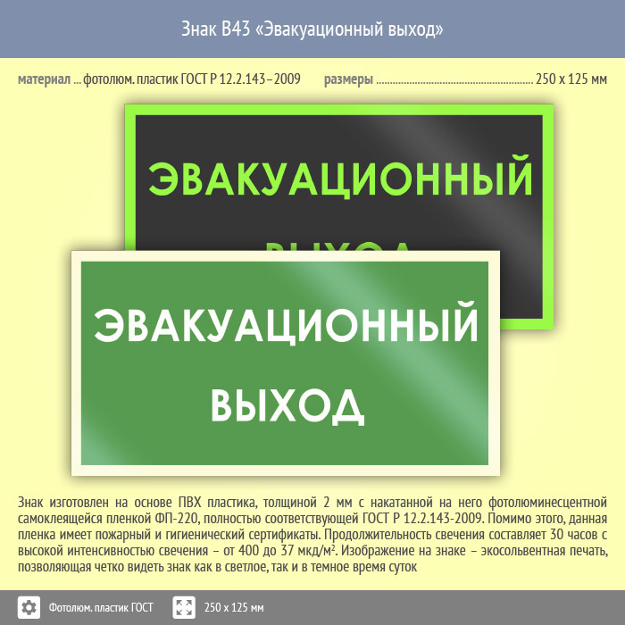 Знак B43 «Эвакуационный выход» (фотолюминесцентный пластик ГОСТ 34428-2018, 250х125 мм) в Хотьково купить