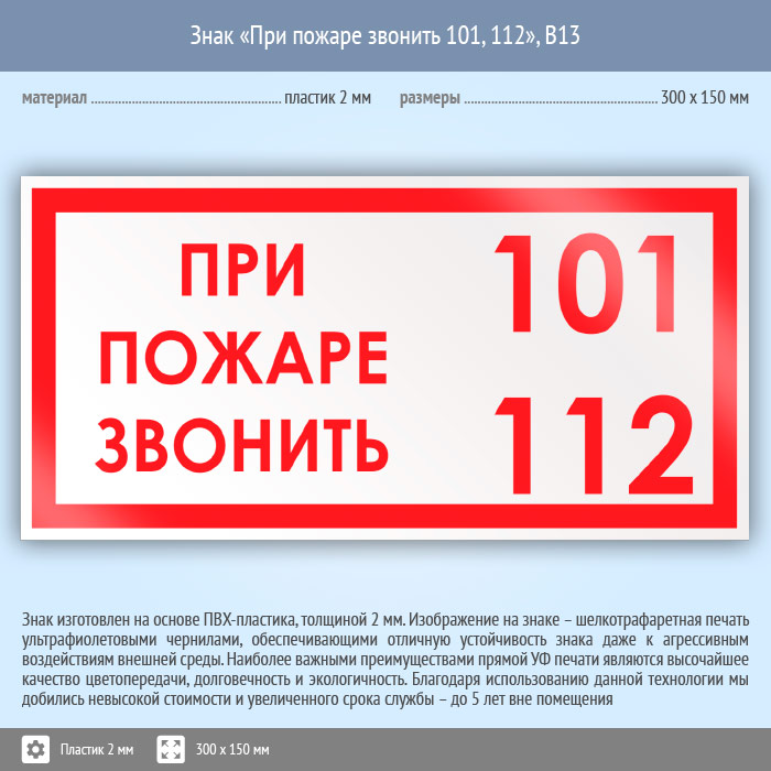 Знак «При пожаре звонить 101, 112», B13 (пластик, 300х150 мм) в Хотьково купить