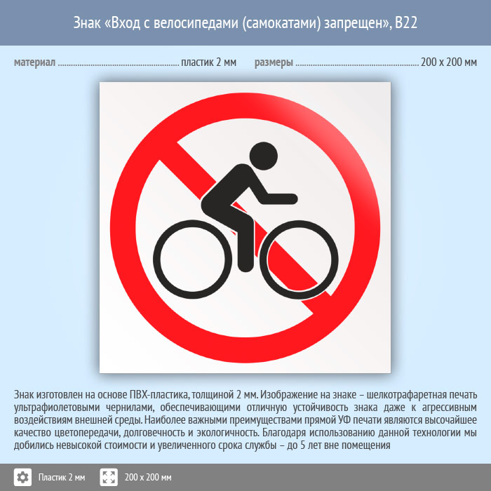 Знак «Вход с велосипедами (самокатами) запрещен», B22 (пластик, 200х200 мм) в Хотьково купить